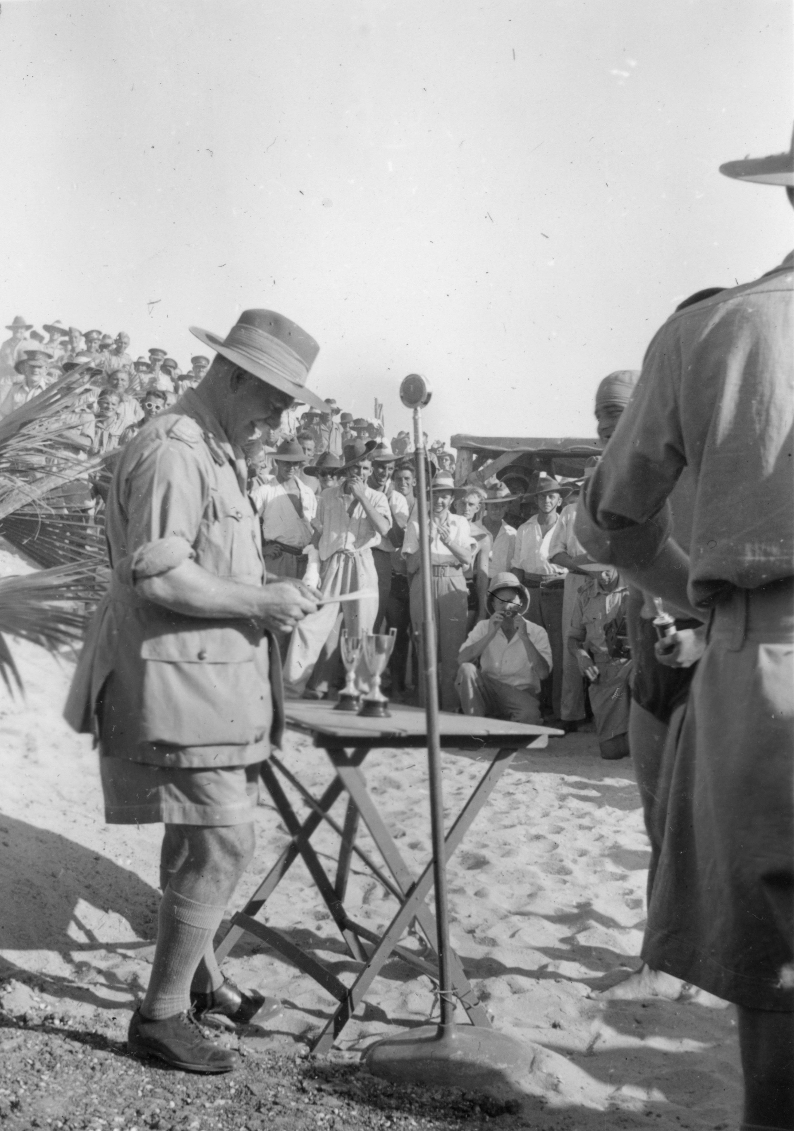 Each time I’ve looked at this photo of Lieutenant-General Thomas Blamey handing out Aquatic Sports Trophies to members of the AIF, I’ve thought I should blog about it. The photo is one of many in my father’s collection that he brought back from the Middle East in 1942, though this one was not taken by him. Similar images of this trophy ceremony in Kantara, on the eastern side of the Suez Canal in Egypt, are available on the the Australian War Memorial site, which suggest that the photo was taken on the same day, 30th August 1941. This week’s WordPress photo challenge, ‘Gathering’, gives me a reason to send it out into the world. I like looking at the individuals in the gathering who are watching Lieutenant-General Blamey giving his speech and congratulating the winners. They’re clapping, smoking and taking photos, but in particular they’re laughing. He must have cracked a good joke!