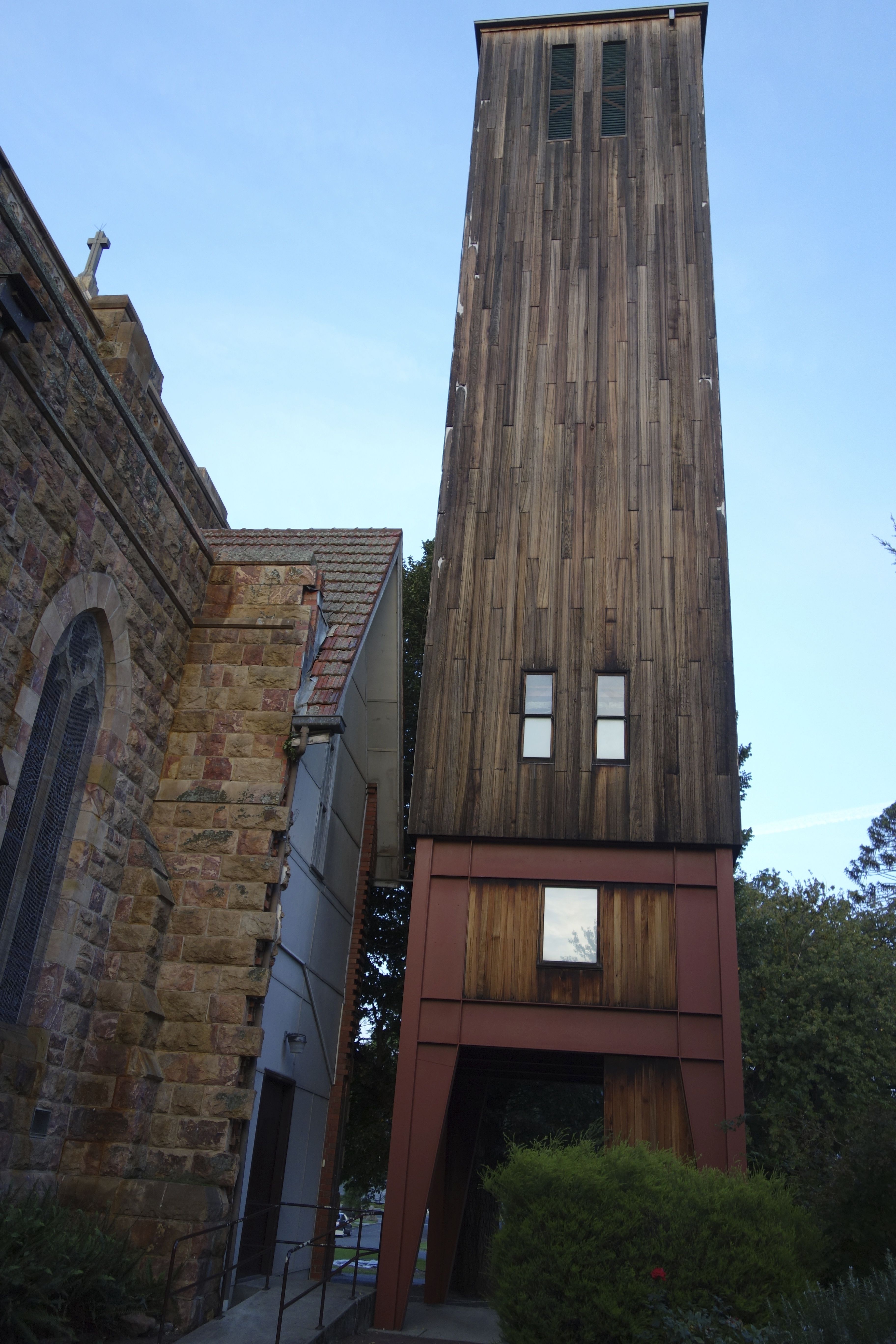 On the way back from the forest I passed a stunning cathedral made from large granite blocks quarried from the nearby Warby Ranges. Unfortunately, even a truly beautiful object has at least one flaw, and a closer look at the church revealed its imperfection. The bell tower was never added when the rest of the building was being constructed, though there was every good intention to finish the structure. The original granite quarry has now been turned into a park, but the granite could be obtained from elsewhere if a million dollars were provided. That’s the estimated cost. Anyone out there with a lazy million, looking for a project? In the meantime the bells hang and ring in this timber and steel tower that looks like it’s just landed.