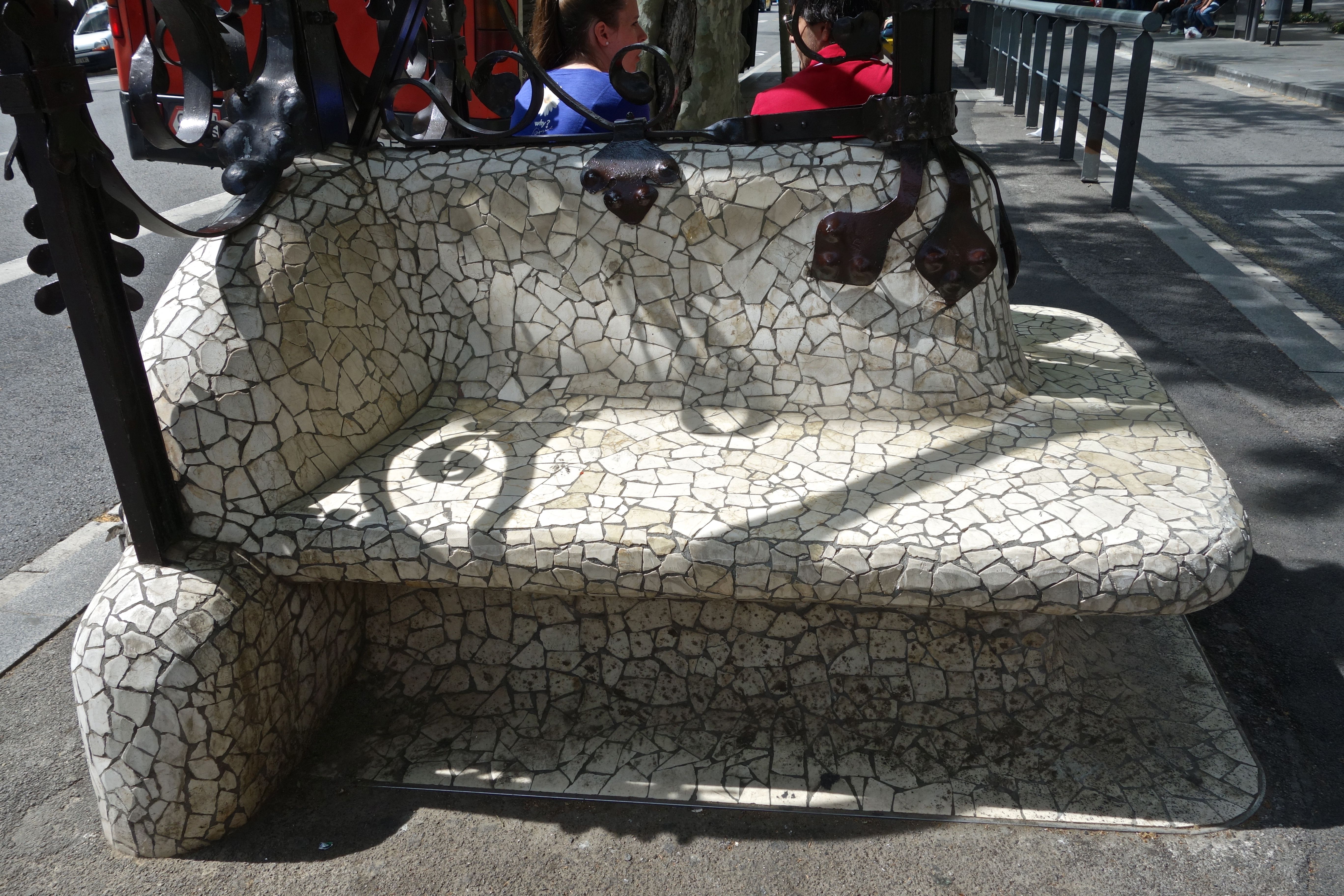 I sat on this bench to read a city map, looking for famous Barcelona art and architecture. But I was sitting on something more interesting than all the tricky buildings and their perplexed spectators. For, when I stood up, I saw the shadows cast by the twisting entanglements of the ironwork and the complexity of the mosaic tiles over the curved edges of the seat, and realised this was an excellent way to make art publicly useable and inclusive rather than exclusive. When you sit on the bench, you are part of the art.