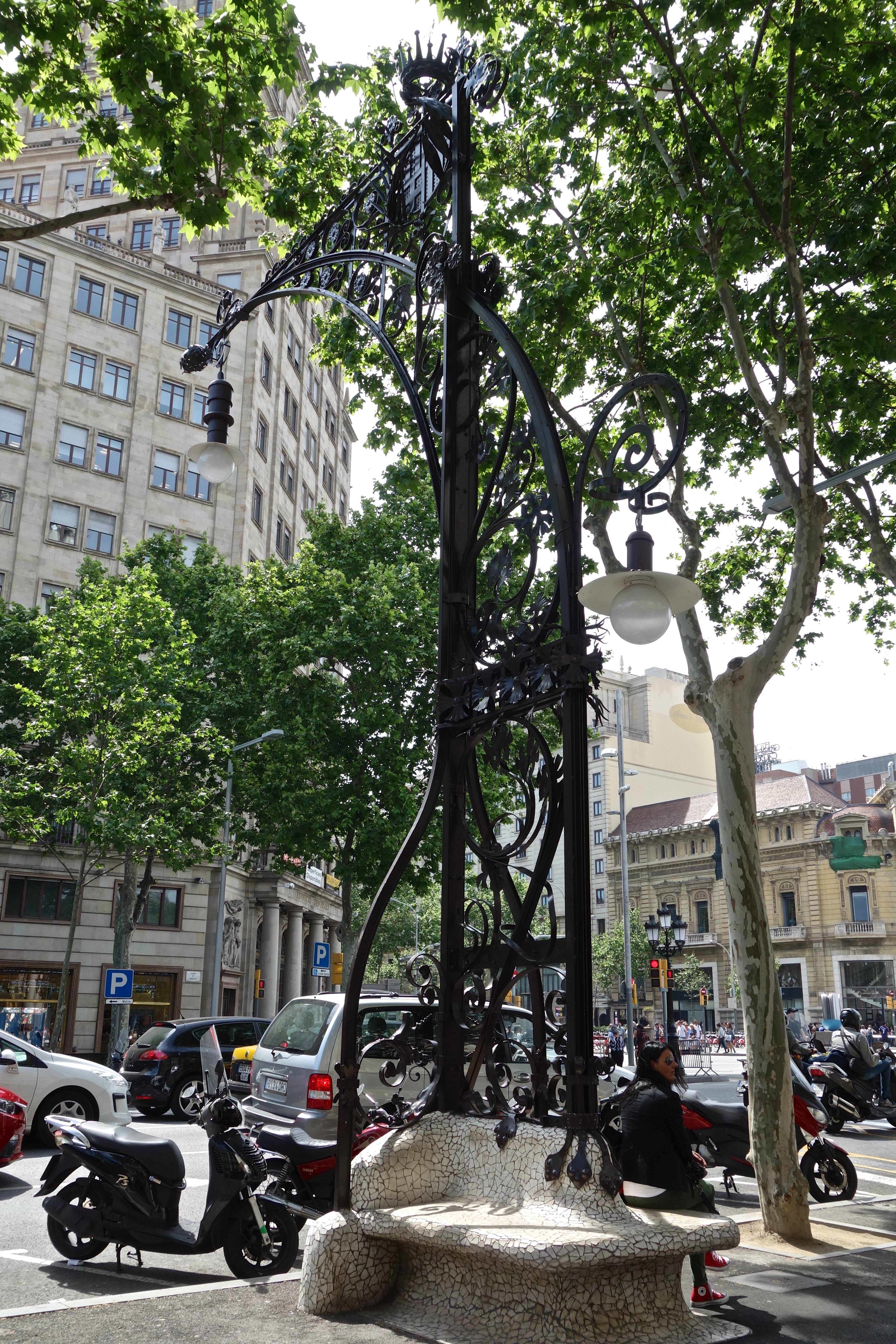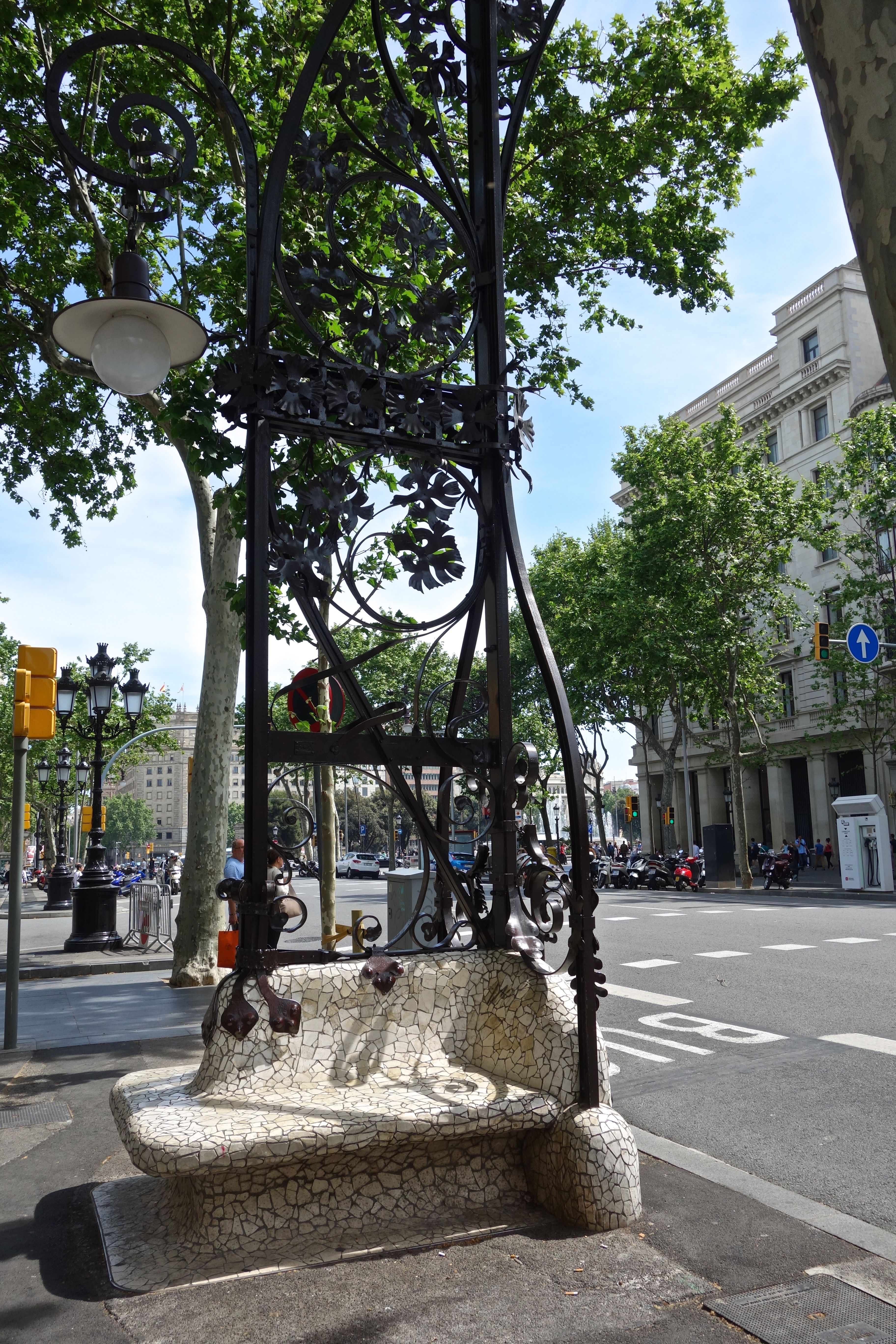 But, for me, what was most tricky and perplexing were the bench-lamp-posts designed in 1906 by Pere Falqués et Urpí, a Catalan Modernist architect. There are 32 of them along the passeig. The benches are covered in ceramic mosaics, a technique typical of Catalan modernism (think Gaudi), and the lamp posts are of wrought iron rising up from the bench in a whiplash form, a characteristic of Art Nouveau generally (known as Modernism in the Catalonia region of Spain, which includes Barcelona.)
