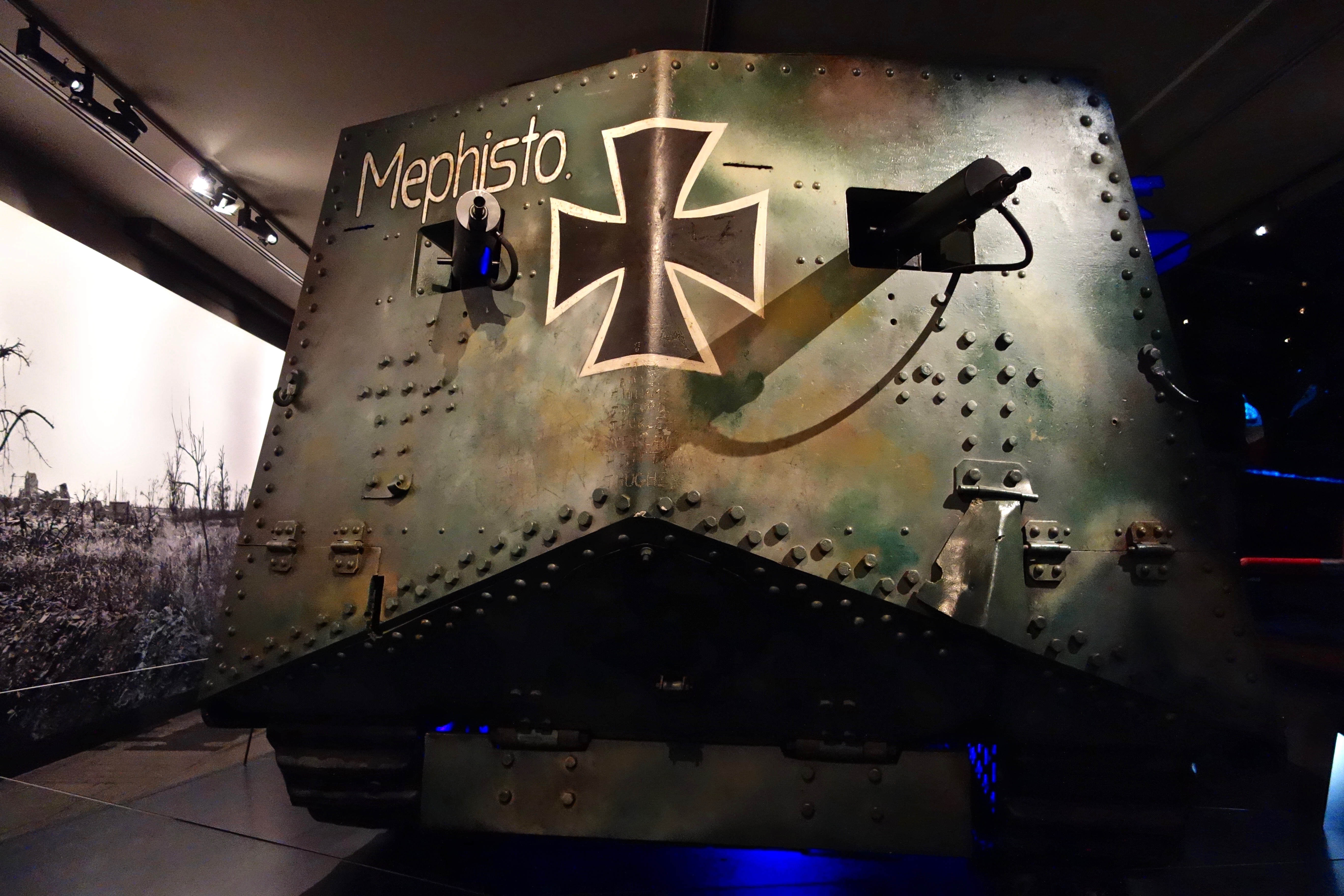 An aside: the last couple of times I’ve been to the War Memorial to photograph my relatives’ names, I’ve read the banners advertising the presence of Mephisto, the Rarest Tank in the World (they were still there when I took the photo above, but in preparation for Anzac Day on Monday, they’ve been removed). Today I decided to see Mephisto for myself. It’s a Sturmpanzerwagen A7V invented by the Germans, and Mephisto is the only one of its kind left in the world. It has a painted red Faustian demon on the right side, carrying a British rhomboid-shaped tank under its arm. Hence the name Mephisto, short for the Faustian character, Mephistopheles. It was a great lumbering vehicle, hot, cramped and noisy inside, but it was one of the first of many tanks that would change land warfare for ever.