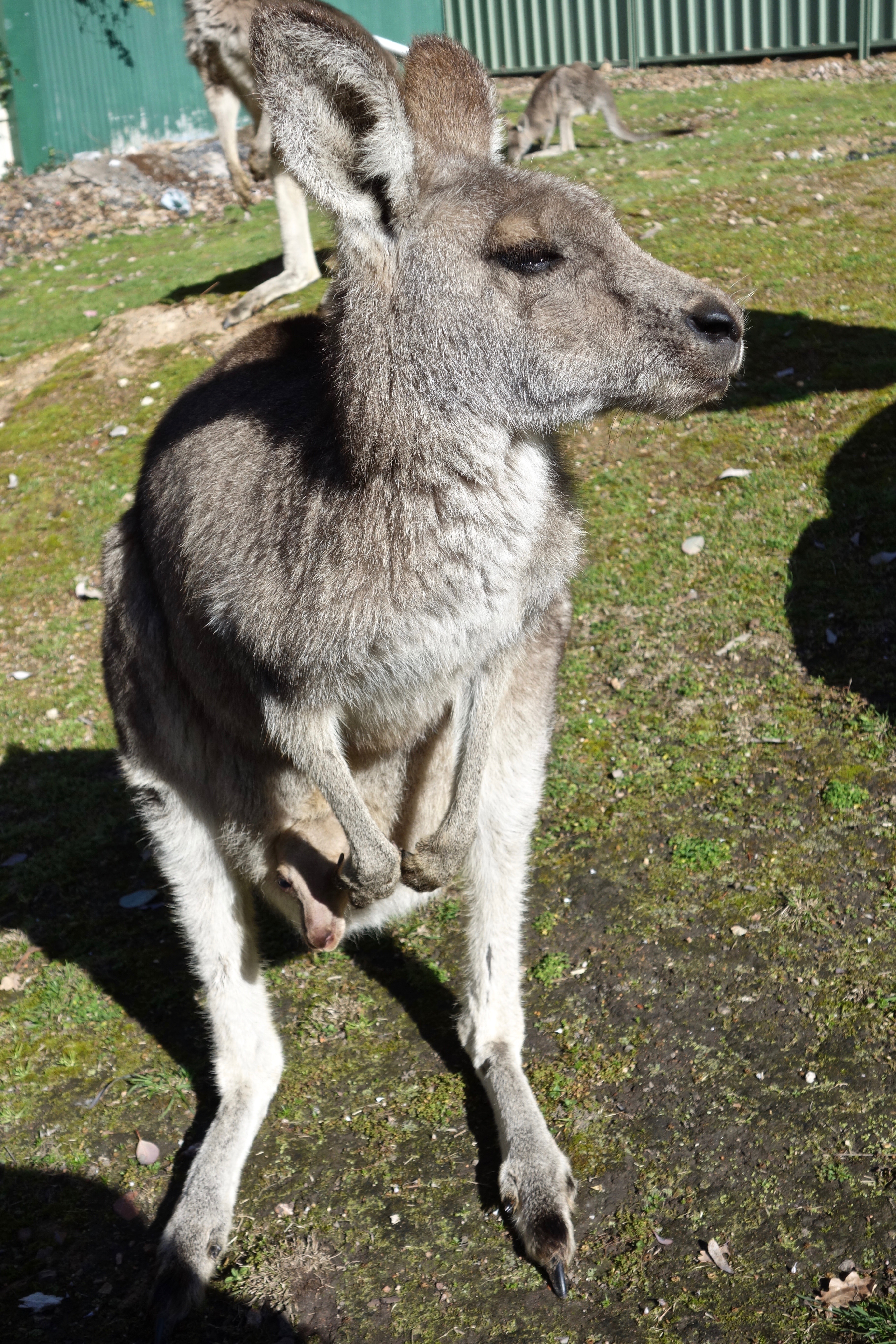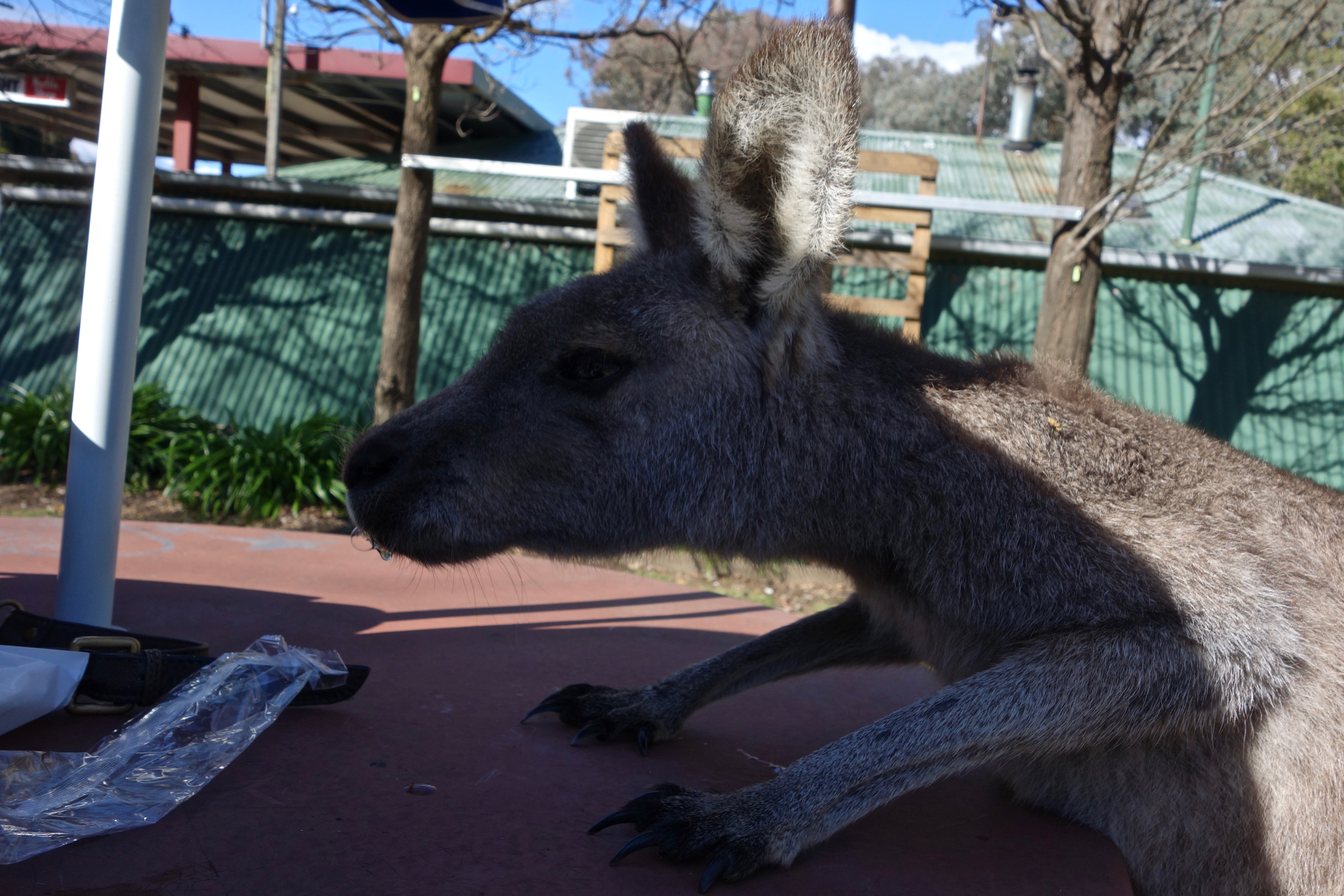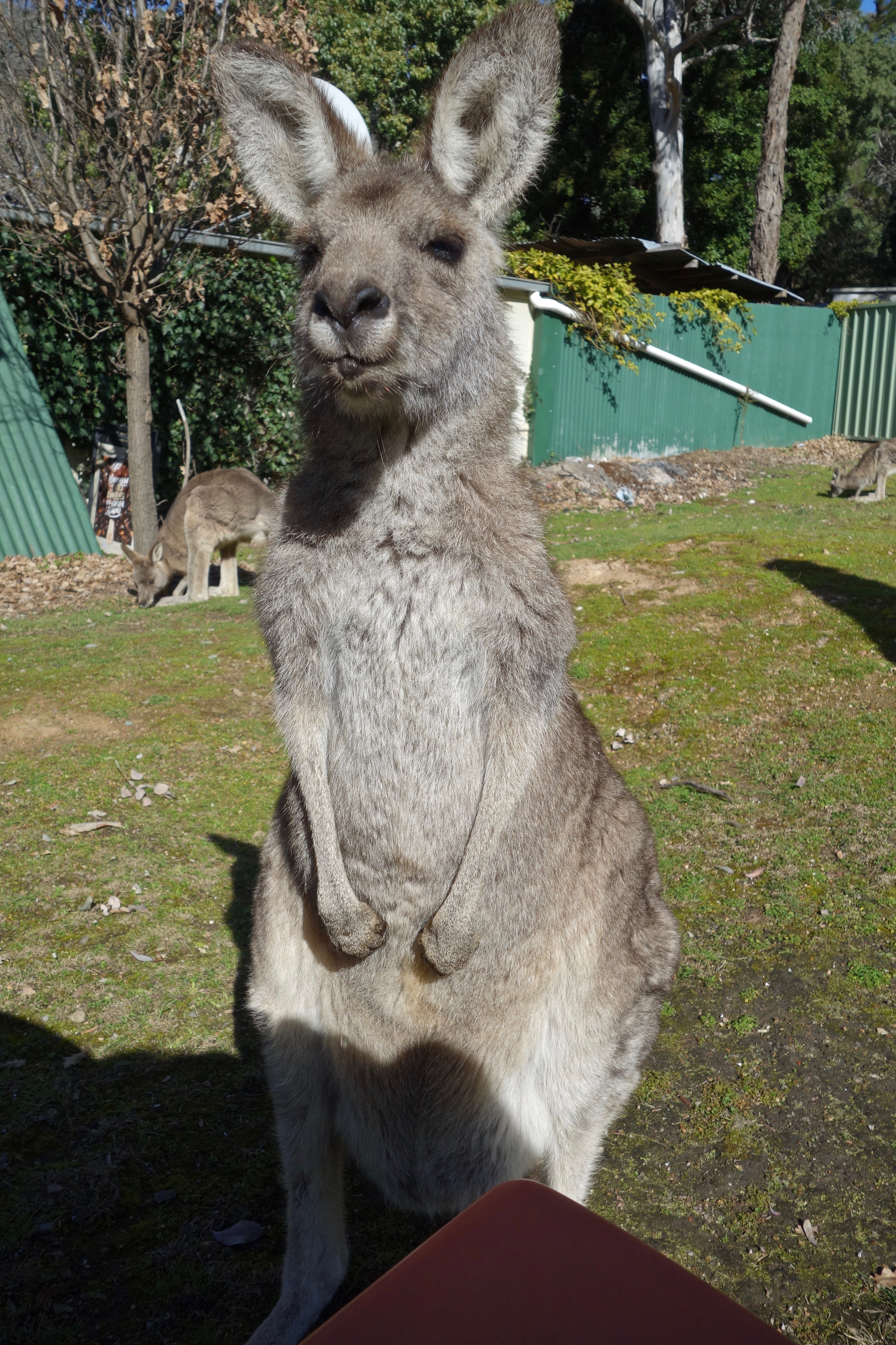 Today – at Burrinjuck Dam: It might be a famous spot for fishing competitions, but the fish in our fish and chips was sadly not from the dam. Still, we enjoyed eating it at a picnic table in the sun, in the serenity of the Burrinjuck National Park, even in the company of five kangaroos that hopped up to us like seagulls coming begging from snackers at the beach. One kangaroo, her joey frequently popping its head out, moved in closer and closer, which would have been more fun if she weren’t drooling and dripping her drool close to our food. But it was not the scent of the fish and chips she had picked up, it was my leather bag. (A clue to the type of leather?) The further away I pushed the bag, the further across the table she stretched.