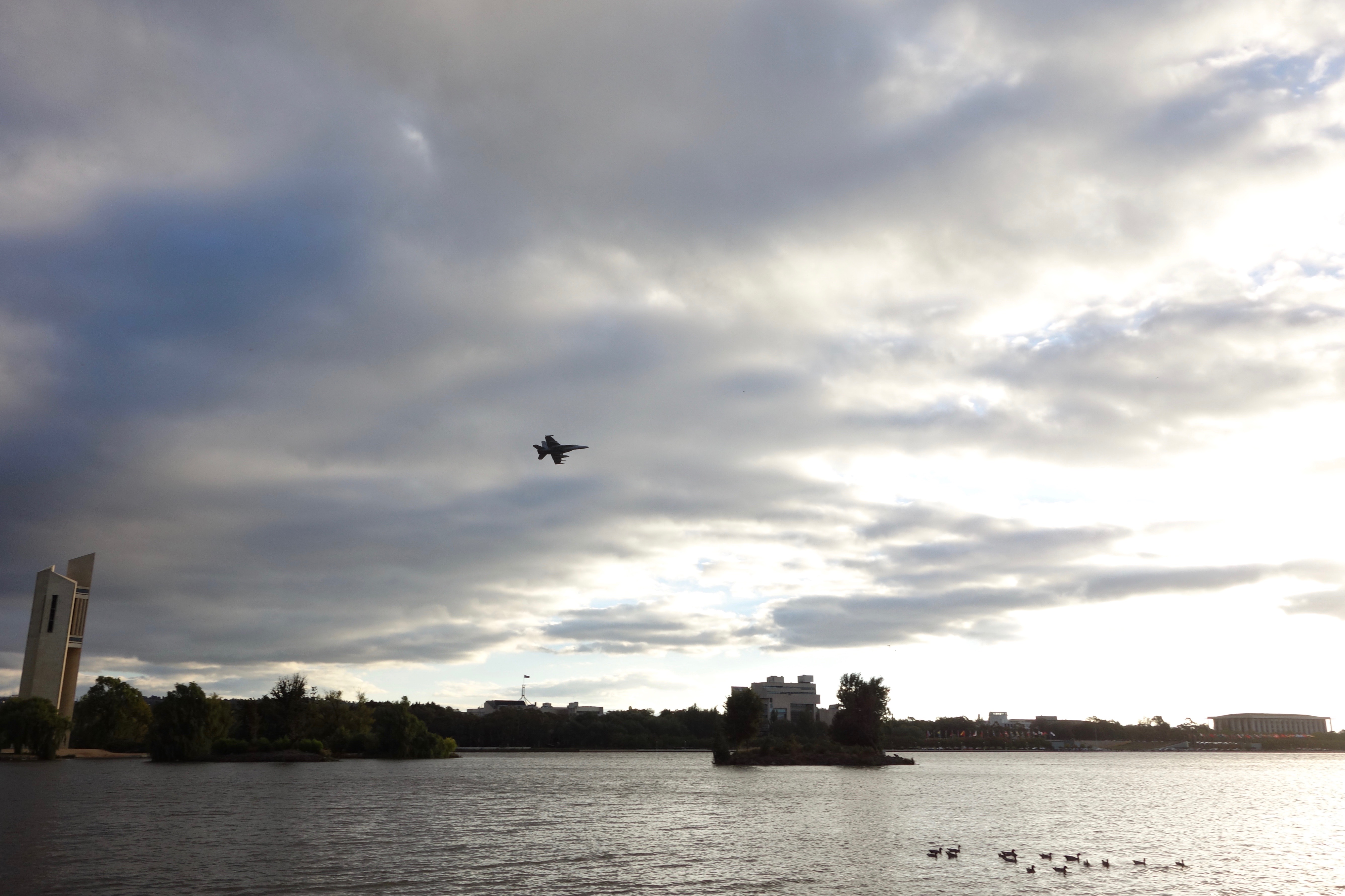 On Friday night at 6.30 daylight saving time, the autumnal sky over Lake Burley Griffin was amazing as the last sunbeams shone on the clouds, a perfect backdrop for an air display by a RAAF F/A-18 Hornet. There were two displays on two nights. These photos are from the first night, the rehearsal! The official show was last night, an introduction to our annual fireworks show, Skyfire.