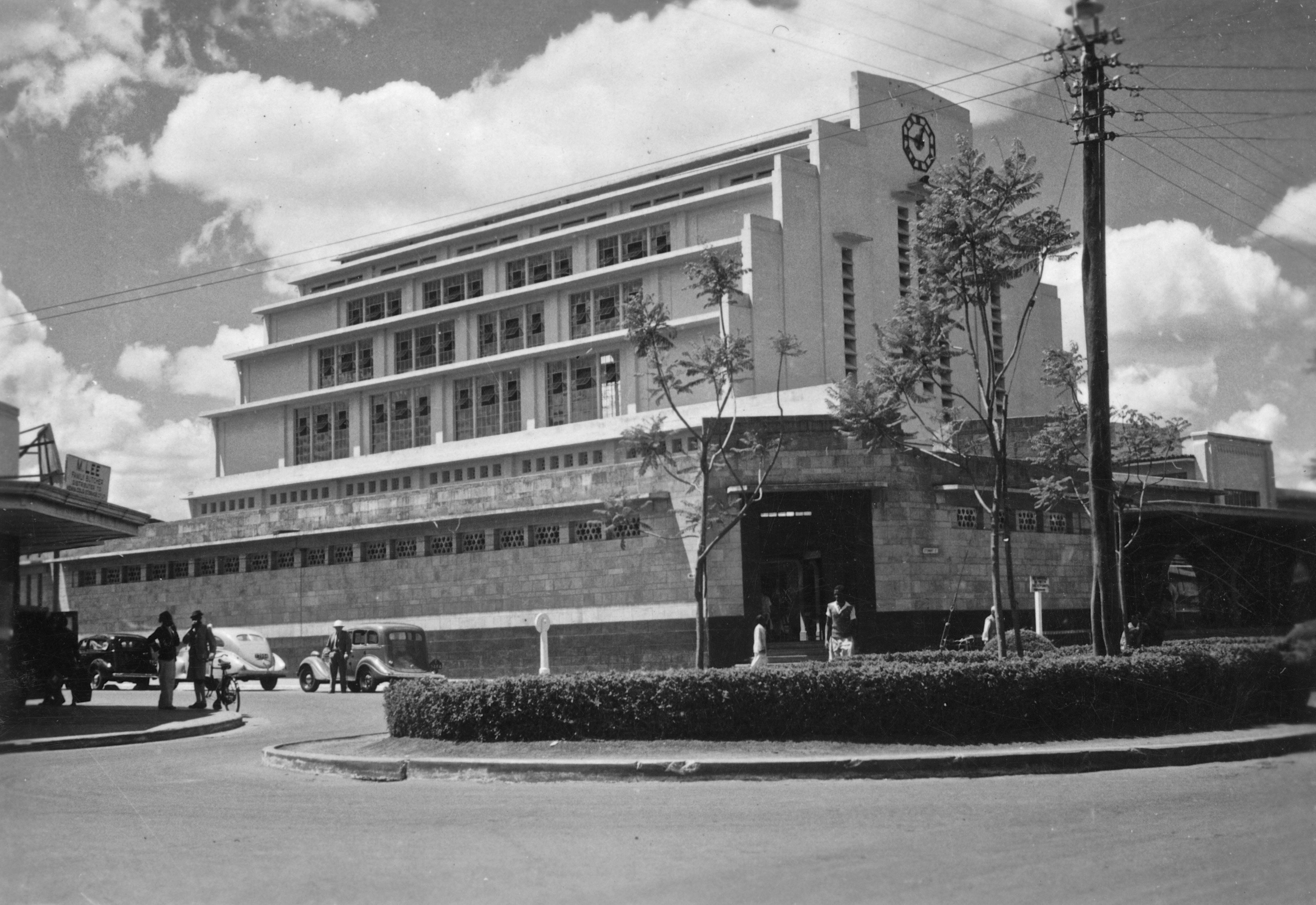 The word ‘angular’ makes me think ‘Art Deco’, the popular visual arts style of the 1920s and 30s that embraced the hard edges of industry, machines and man-made structures rather than the soft, curving, natural lines of the previously popular ‘Art Nouveau’ style. Art Deco buildings are recognisable by their geometric, often symmetrical, forms and decorations: repeated lines, zigzags, steps, and ziggurat shapes. Here’s a photo from Dad’s WWII collection from 1941/42, showing the covered market in Nairobi, built in 1932. It’s now called the City Market.