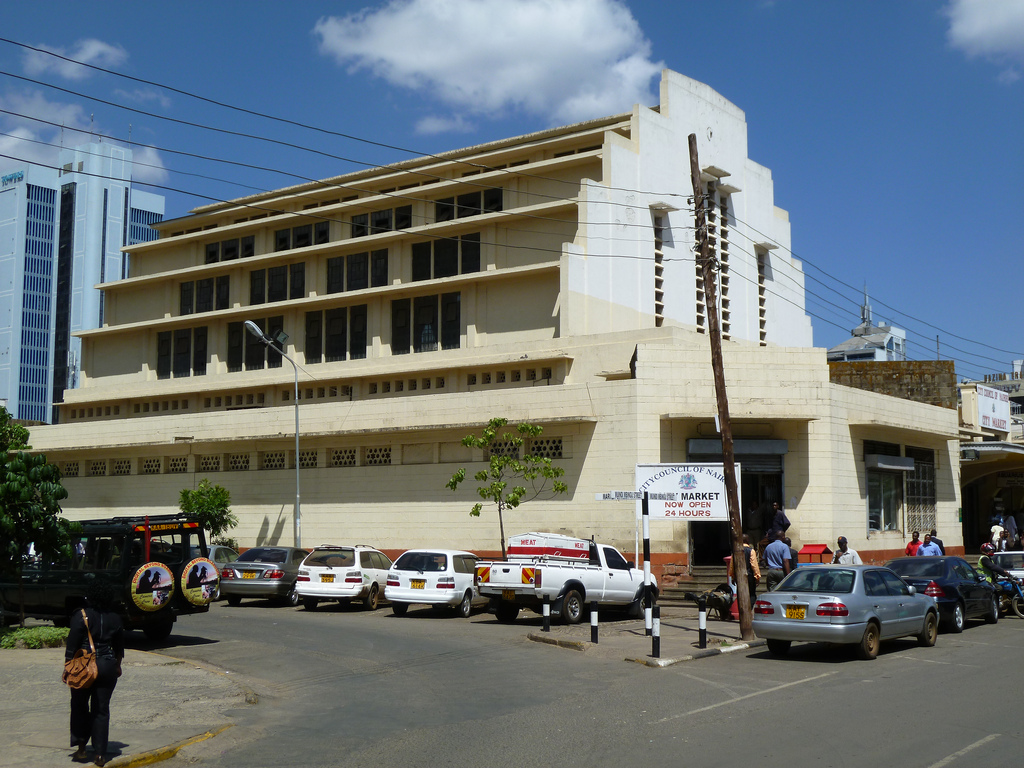 The City Market building in central Nairobi has the classic features of Art Deco architecture: symmetrically stepped walls and straight lines at every turn – even the clock is octagonal. Well, that was in the 1940s; the clock is no longer there, as you can see in the photo below, taken in 2011.