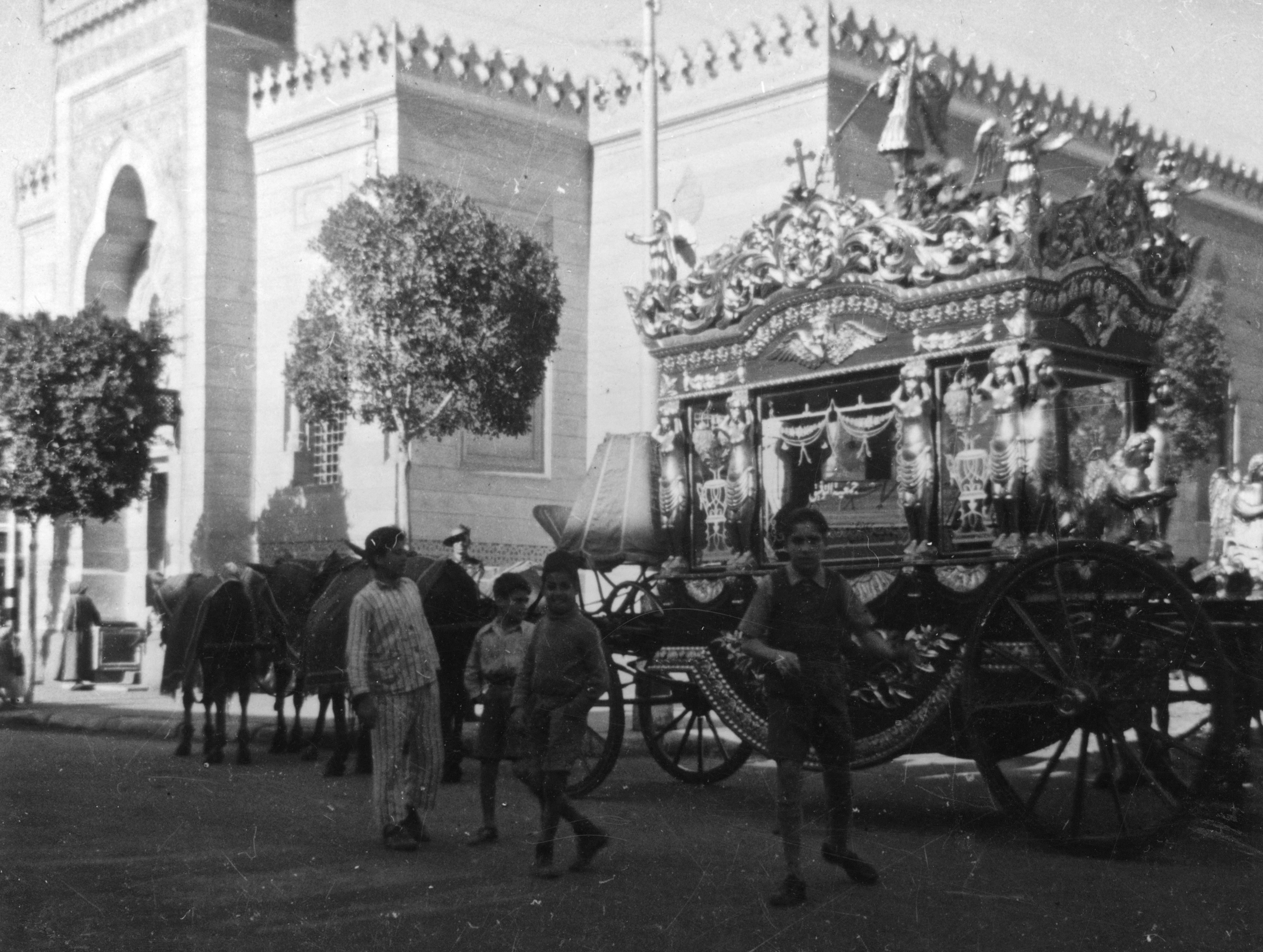 Someone is going out in style in what must be a Christian funeral, the carriage decked with a cross and angels, moving past a mosque! This is the first mosque built in Heliopolis, the present-day outer suburb of Cairo which the Belgian Baron Empain built out of the desert in the early 1900s. The mosque was built in 1911 in Mosque Square (Midan al-Gami).