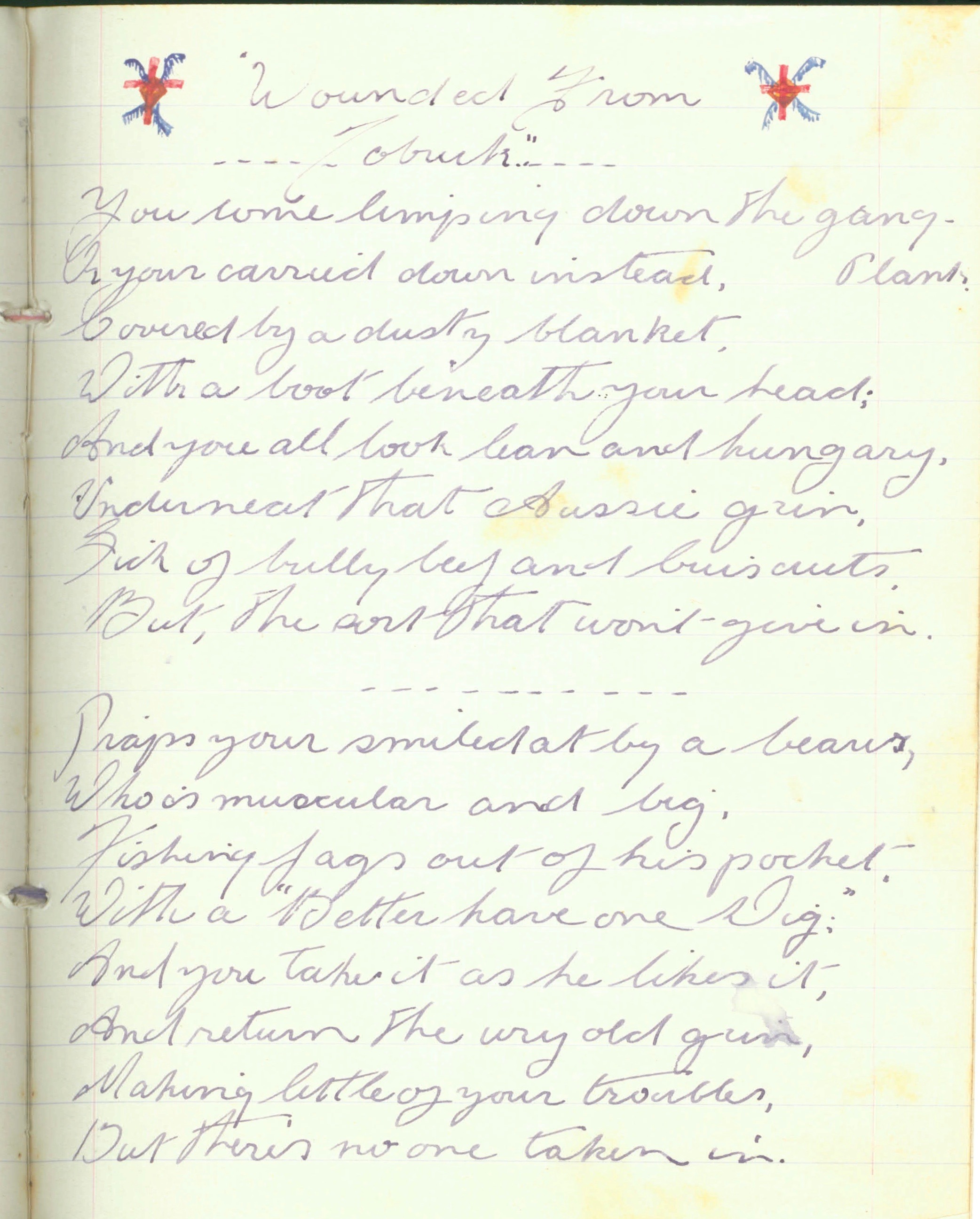 Finally, a poem. Here are the first two stanzas of Wounded from Tobruk, recorded by my father in his poetry book, but written by James Andrew “Tip” Kelaher and published in The Bulletin on 29 October 1941. Sadly, Tip Kelaher was killed the following year at El Alamein in Libya. Here’s the page in my father’s writing, followed by my transcription with corrections: