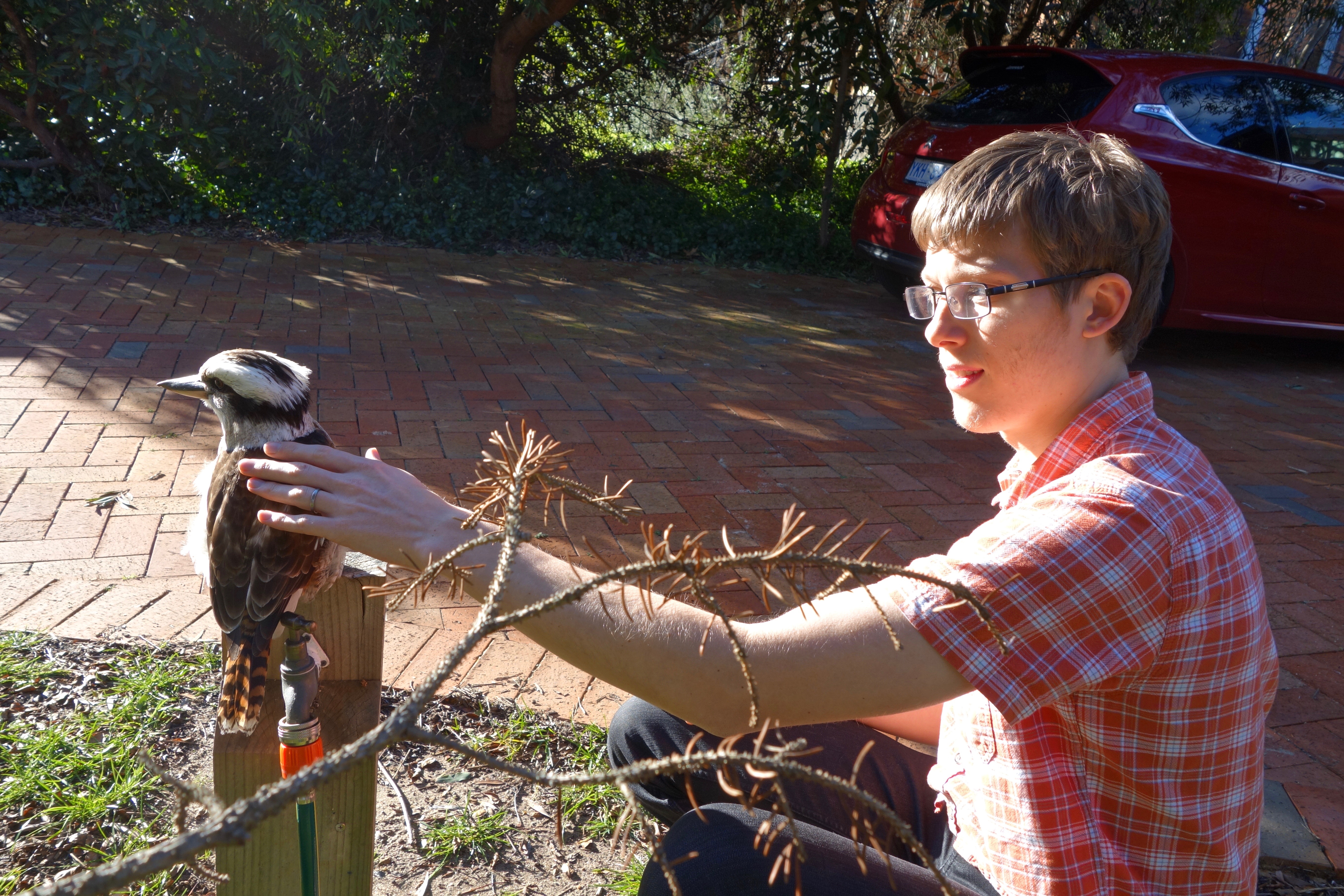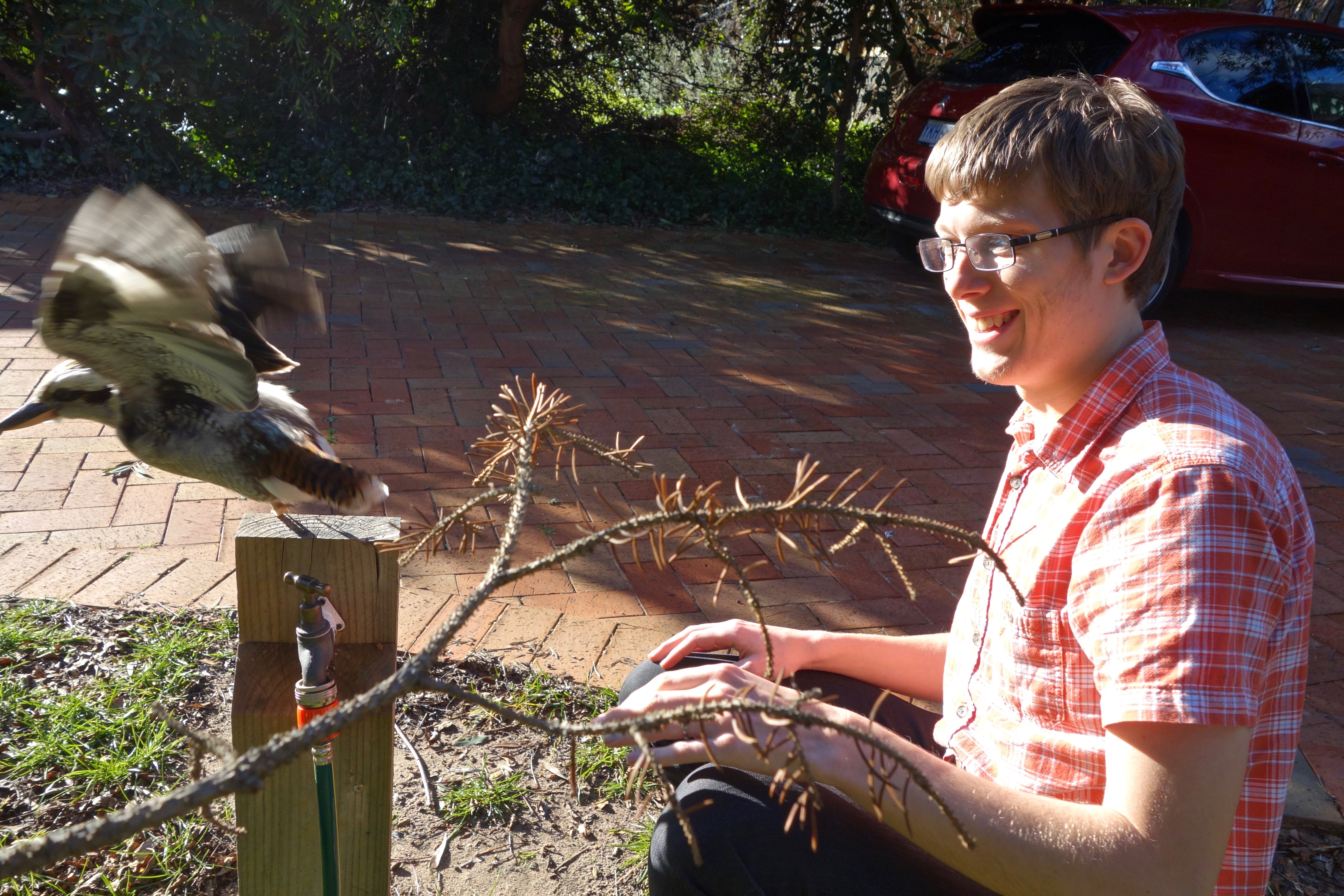 Last week – at home: A kookaburra was lingering in our front yard, sitting in the old ash tree, on the hose reel, on the gate, and finally on the tap post. Merry merry king of our yard is he. My son felt a personal challenge to try to pat him, and succeeded. It’s a fun Australian memory for Josh now; a few days later he moved to Munich with his wife, and today sent me a photo of himself beside a pretty German stream.