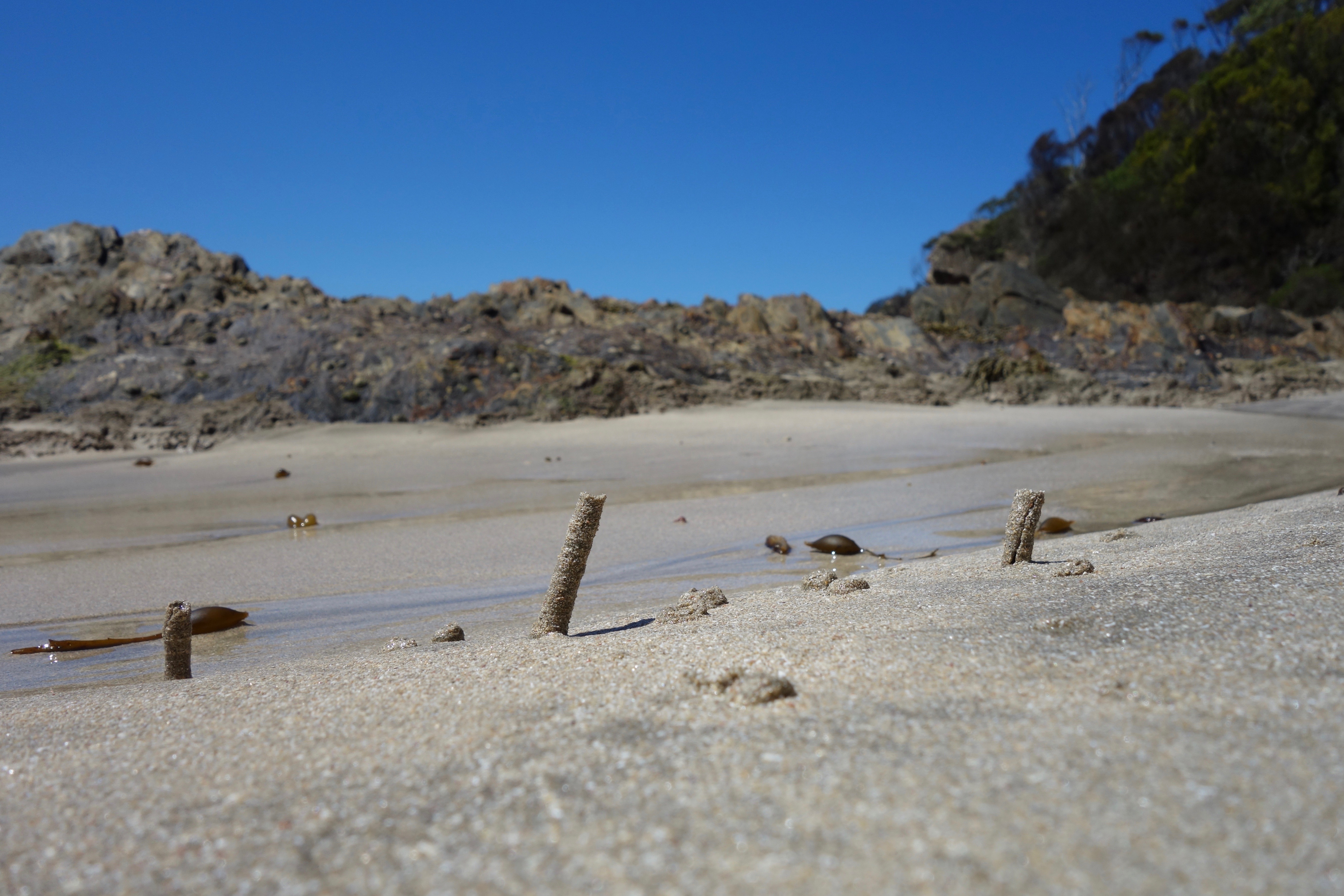 By the sea, natural beauty fills my head and heart to the brim. There’s no room for anything negative, only praise. Just look at these three tubes protruding from the sand. I know little about them but a search leads me to believe they were built by worms. Amazing, fragile structures.