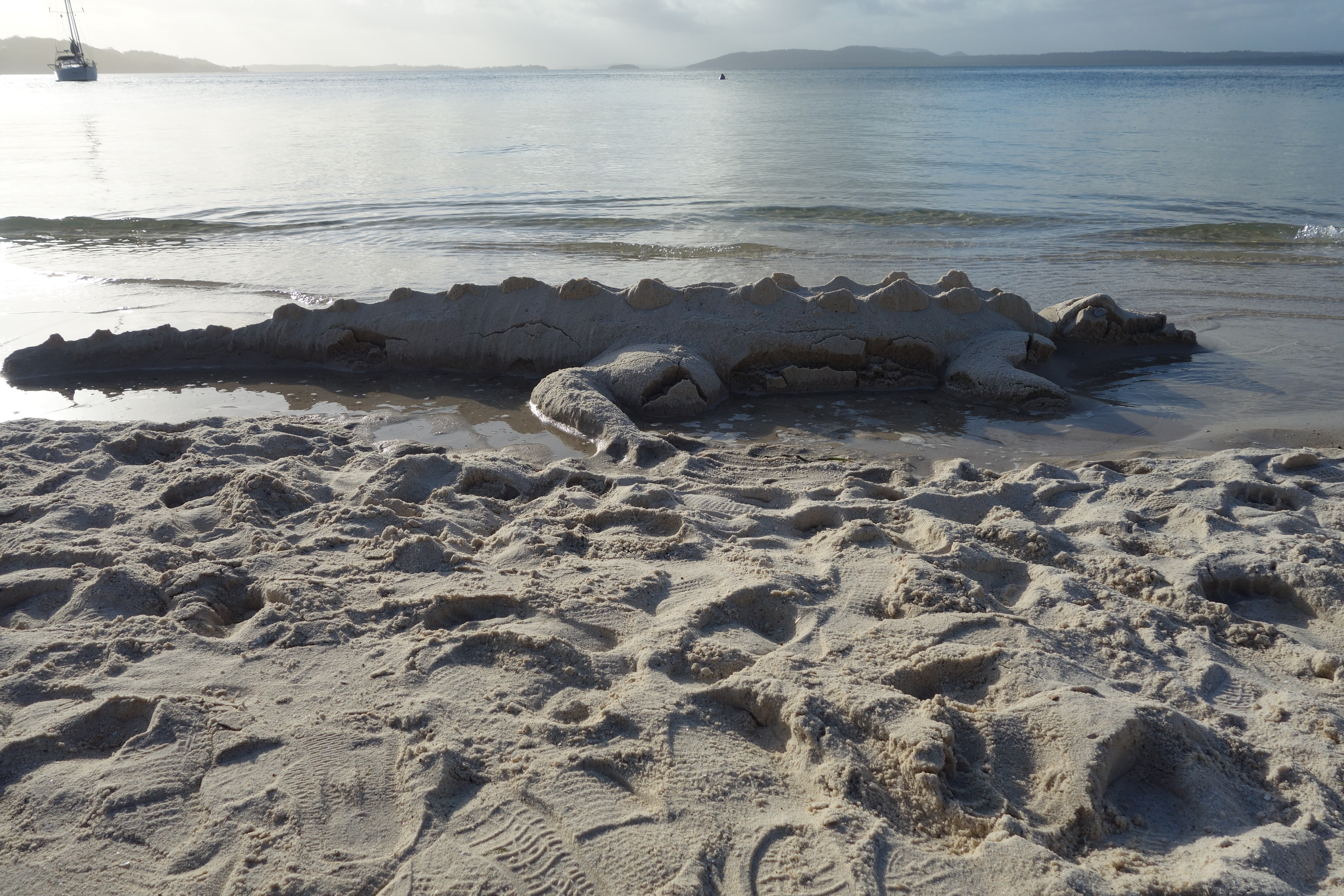 While we all leave our footprints on the beach – the loneliest stroller is aware of all those who strolled before her – sometimes humans can leave behind something admirable. Like wandering minstrels, wandering artists can enhance nature, and out of the kindness of their hearts make a sand sculpture, a piece of public art, temporal as it will be. I passed this crocodile at the water’s edge in Port Stephens late one afternoon and felt very lucky to catch it before the incoming tide broke it up completely.