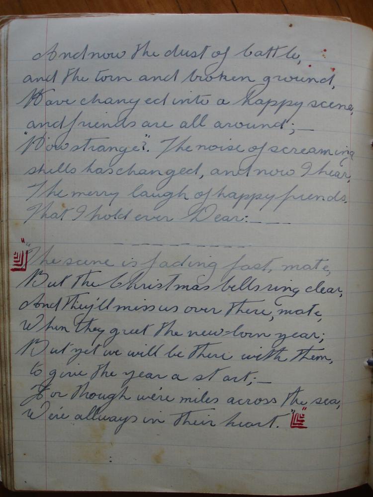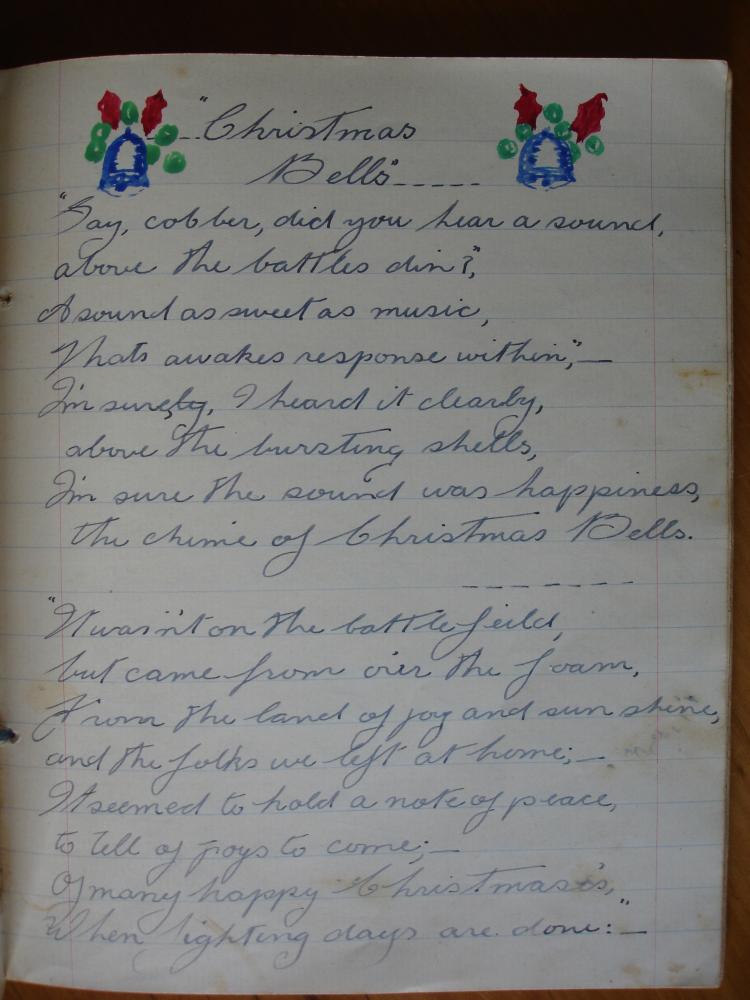 Another form of comfort was writing. So far away from home at Christmas, the soldiers didn’t feel festive or joyous, especially if they’d seen horrors and lost companions in grim battle scenes. Many wrote poetry about the separation from girlfriends and families; the following poem, Christmas Bells, expresses both kinds of grief, separation that is temporary and the other, which is for ever. The poem is in my father’s poetry anthology, but it was written by Spr. E. Locke and was published in the A.I.F. News Christmas edition in the photo above. I’ll add my transcription after the image.